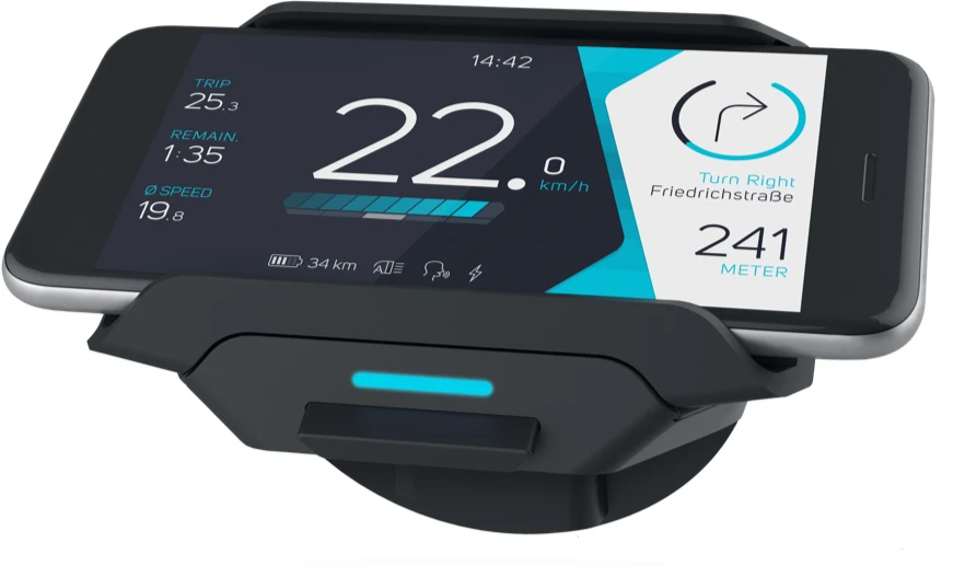 Mit dem COBI.Bike Sport Hub vernetzt du dein E-Bike mit der digitalen Welt. Steuere ab sofort dein E-Bike bequem mit dem Smartphone. Das Sport Hub wird einfach auf den Bosch Nyon bzw. Intuvia Displayhalter gesteckt und mit der Smartphone-App gekoppelt. Im Anschluss kommt das Smartphone wahlweise als vollwertiges eBike Display in die beiliegende Universal Mount Smartphone Halterung auf die Mitte des Lenkers oder in die Hosentasche (Sprachausgabe aus der Hosentasche z.B. für geschalteten Unterstützungsmodus) und schon kann es los gehen.