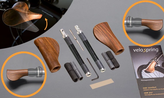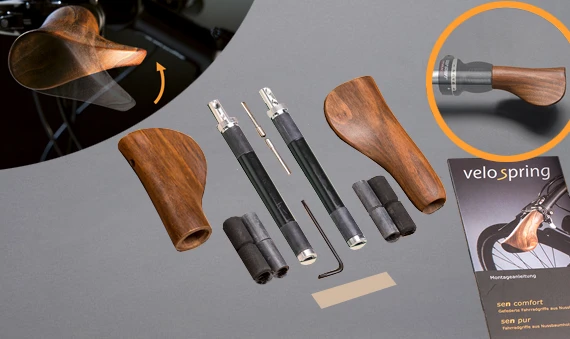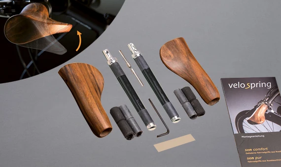 Des Weiteren sind die ergonomisch geformten Velospring Fahrradgriffe aus edlem Nussbaumholz. Durch die intensive Behandlung des Nussbaumholzes durch mehrmalige Polier- und Ölungsvorgänge, liegen die sen comfort Fahrradgriffe besonders angenehm in der Hand und tragen zu einer bequemen Fahrradtour bei.
